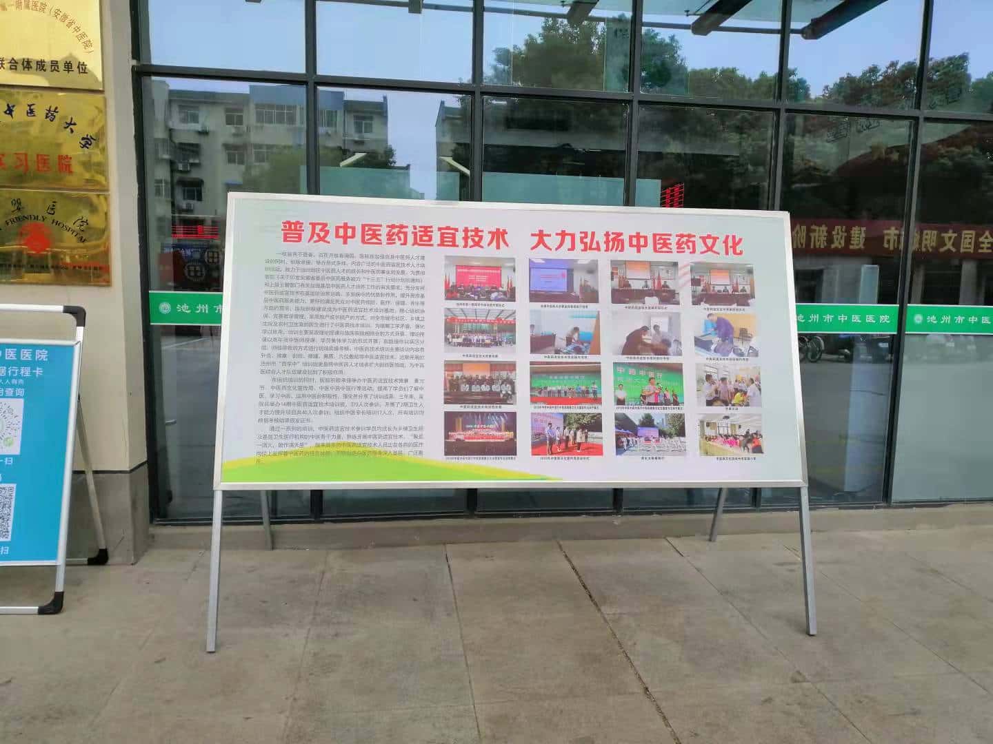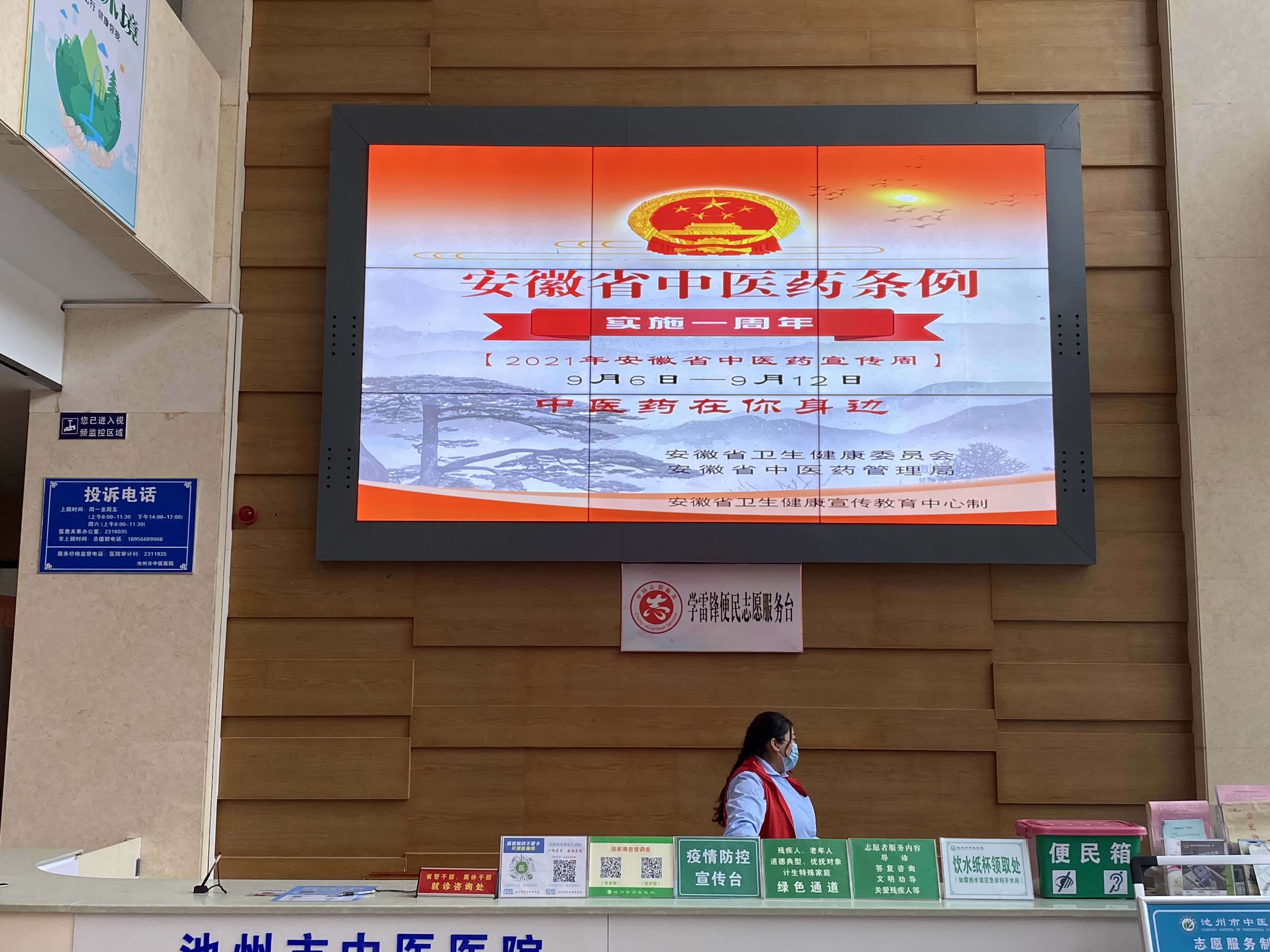 多措并举,营造氛围。医院在入院口悬挂庆祝安徽省中医药条例宣传横幅。在医院大厅显示屏展播中医药条例实施一周年宣传海报,并设置海报展架,提升宣传氛围。