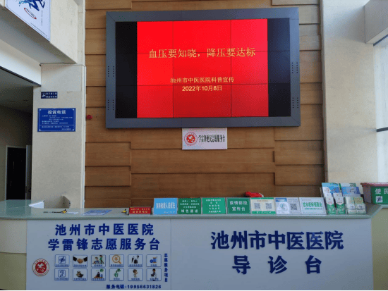 我院于10月8日在院内导诊处发放高血压防治手册,并在院内大屏幕上滚动播放高血压防治宣传PPT,让进院人员知晓高血压病对人体的危害,加强对高血压病的防治。