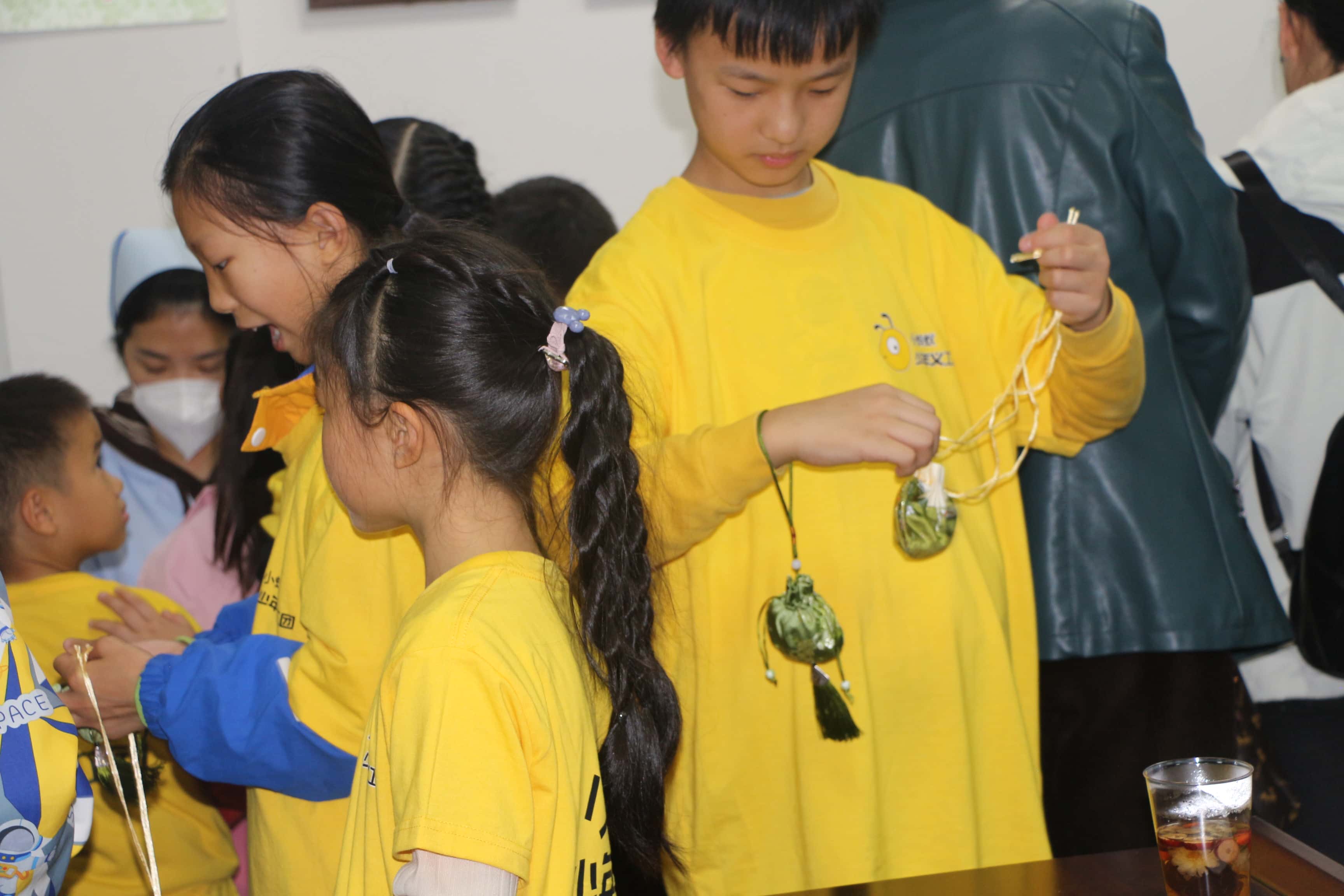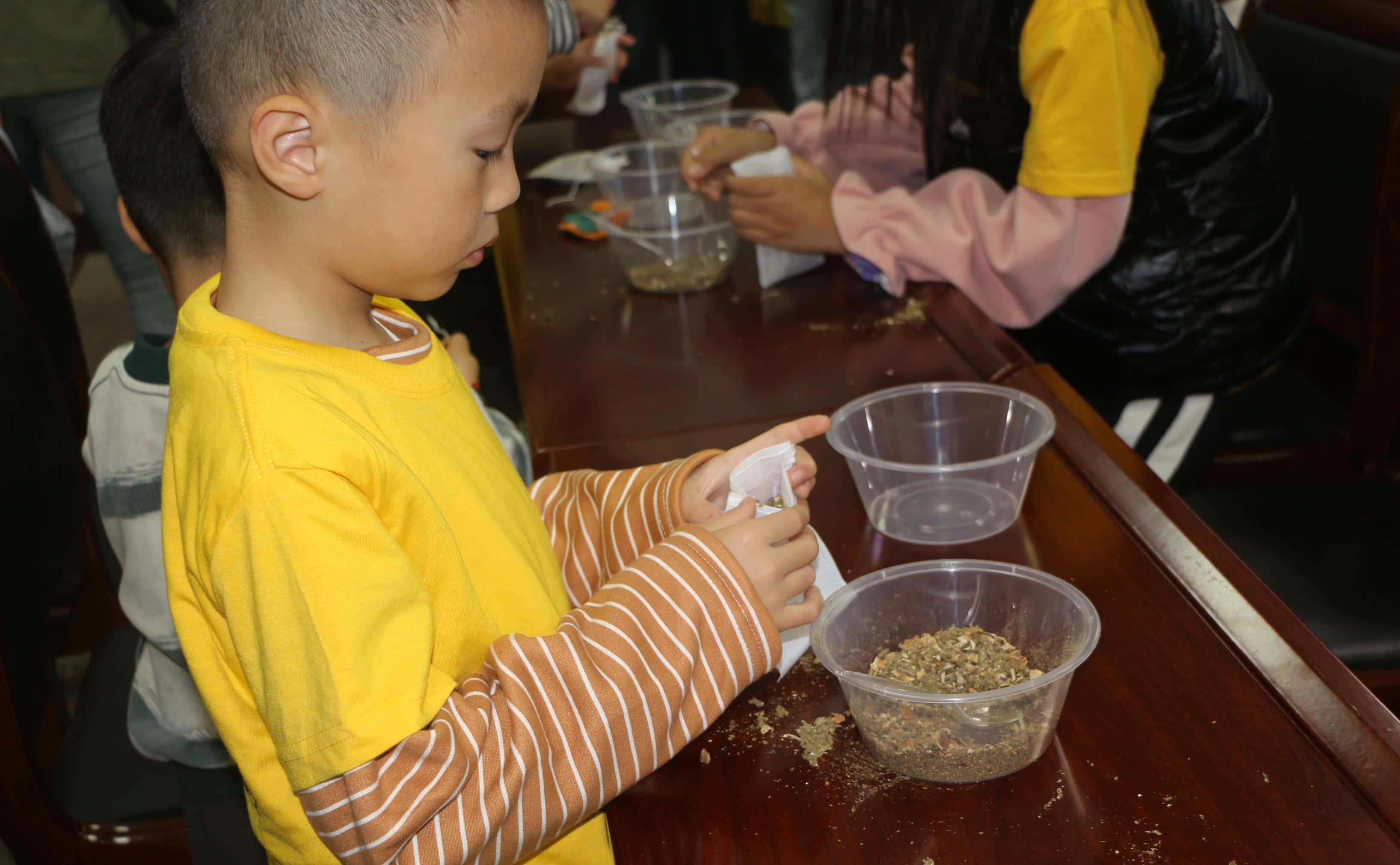 紧接着是深受欢迎的中药香囊DIY环节。在工作人员的帮助和指导下,小朋友和家长们一起将事先研磨好的艾草、薄荷等中药材料倒进香囊袋中封口扎紧,不一会儿,一枚枚精美的中药香囊就制作完成了!
