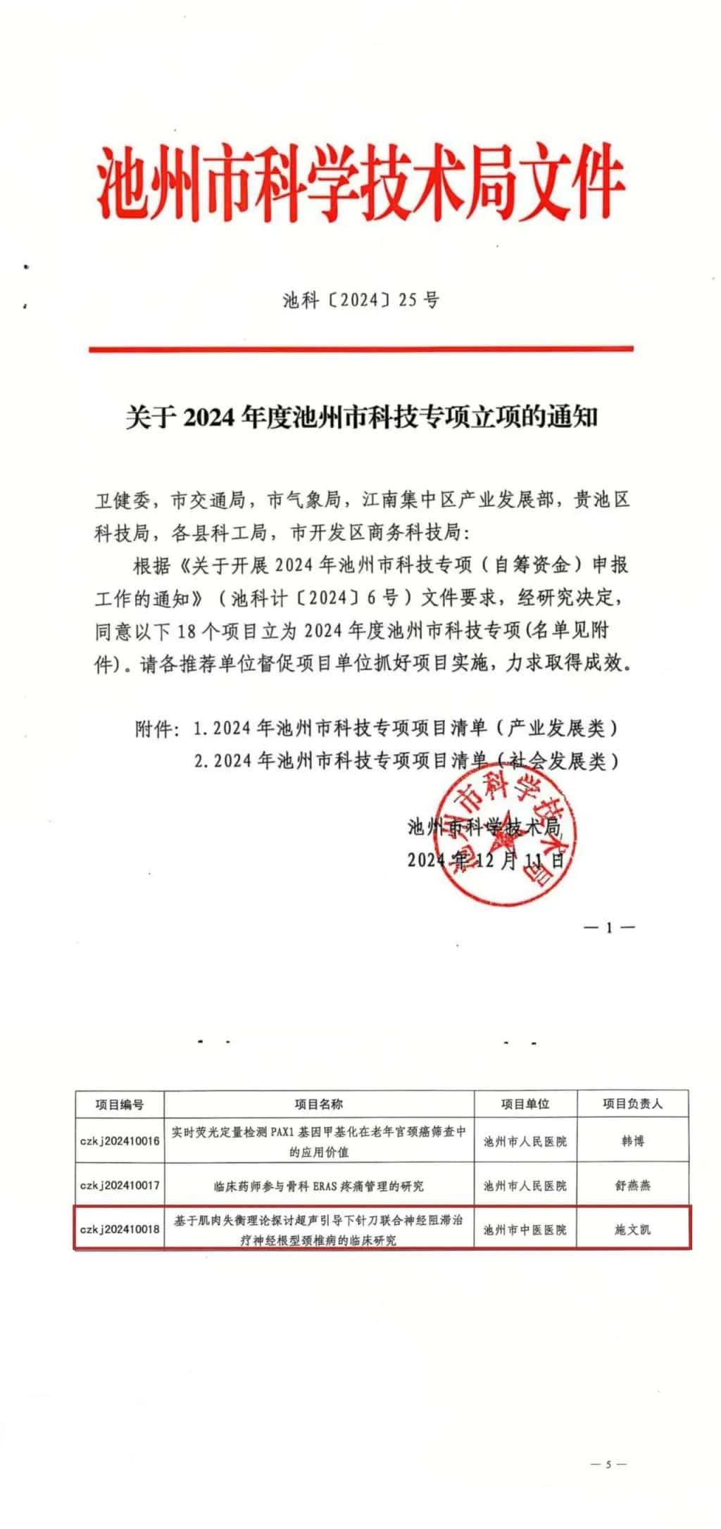 近日,从池州市科学技术局下发的《关于2024年度池州市科技专项立项的通知》文件中获悉,我院施文凯团队申报的“基于肌肉失衡理论探讨超声引导下针刀联合神经阻滞治疗神经根型颈椎病的临床研究”科研项目获批立项。