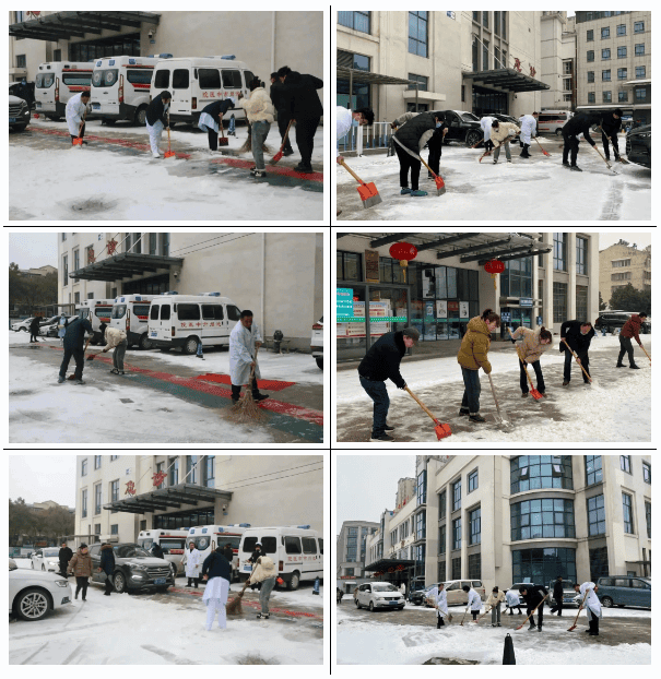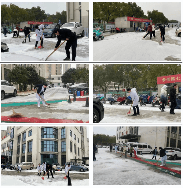 面对雨雪冰冻天气,我院职工充分发扬了不怕苦、不怕累的奉献精神,借助铁锹、雪铲、扫把等工具清扫道路积雪,并铺设防滑垫和设置安全警示牌。风雪虽寒,情暖人心,尽管脸颊和双手被冻得冰冷通红,但也丝毫没有影响到他们扫雪除冰的热情和工作效率,铁铲与地面的摩擦声此起彼伏,忙碌的身影形成了一道道亮丽的风景线。经过一段时间的齐心协力,院内主要道路的积雪和冰层很快被清扫干净,为群众们开辟出一条就医绿色通道。