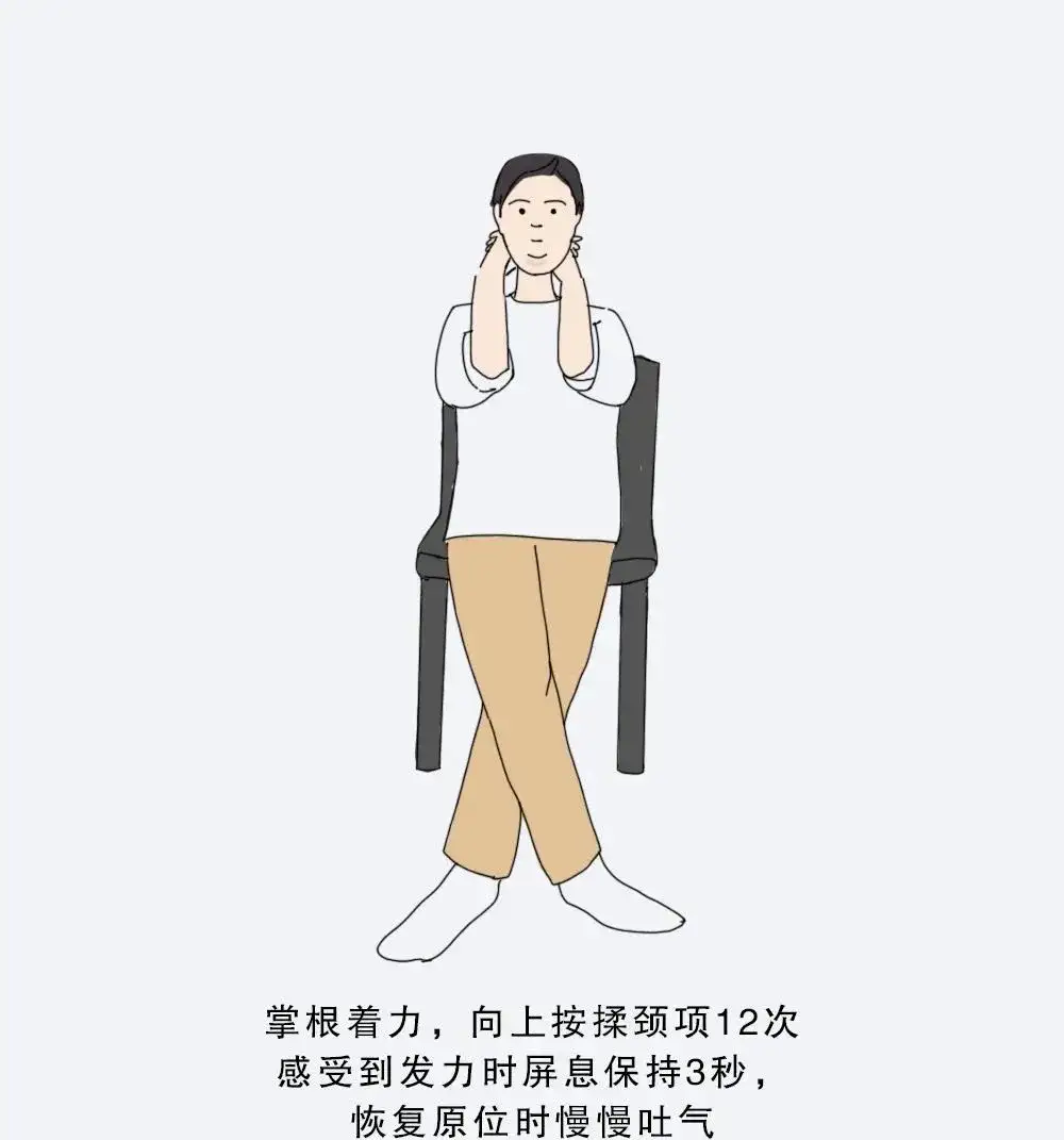 5、每天一组颈部按摩操,适时活动颈部,能促进血液循环,有助于改善眼部疲劳;