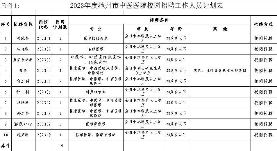 附件1:2023年度池州市中医医院校园招聘工作人员计划表