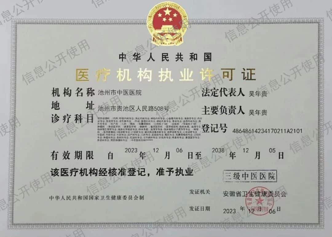 2023年12月6日,安徽省卫生健康委员会正式颁发了池州市中医医院“三级中医医院”执业许可证,标志着我院成功跨入了三级中医医院的行列!