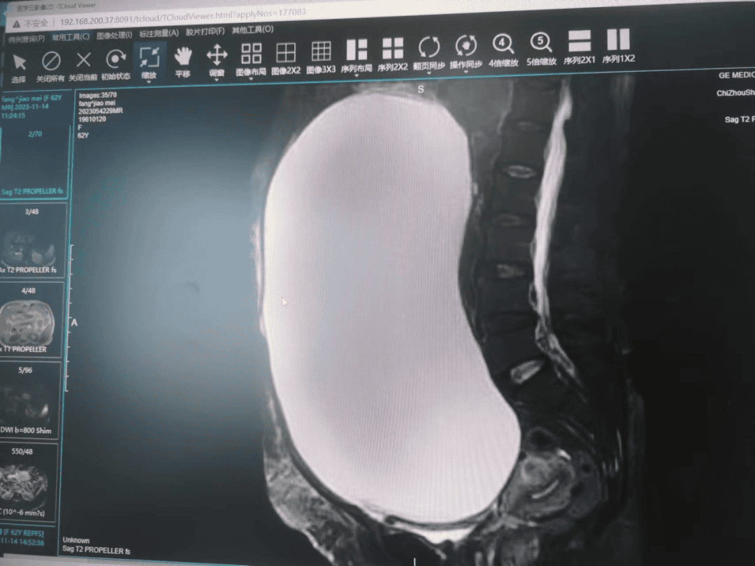 2023年11月14日上午,妇产科冯宝明主任接到外科医生电话:一个62岁老太太因解大小便困难半月就诊,CT提示盆腹腔巨大包块,请妇产科会诊。经查体发现,包块巨大如孕足月大小,从小腹一直到剑突下。为查清包块来源及性质,冯宝明主任立即给病人安排了核磁共振检查,MRI提示包块可能来源于右附件,即将病人转至妇产科进一步诊治。