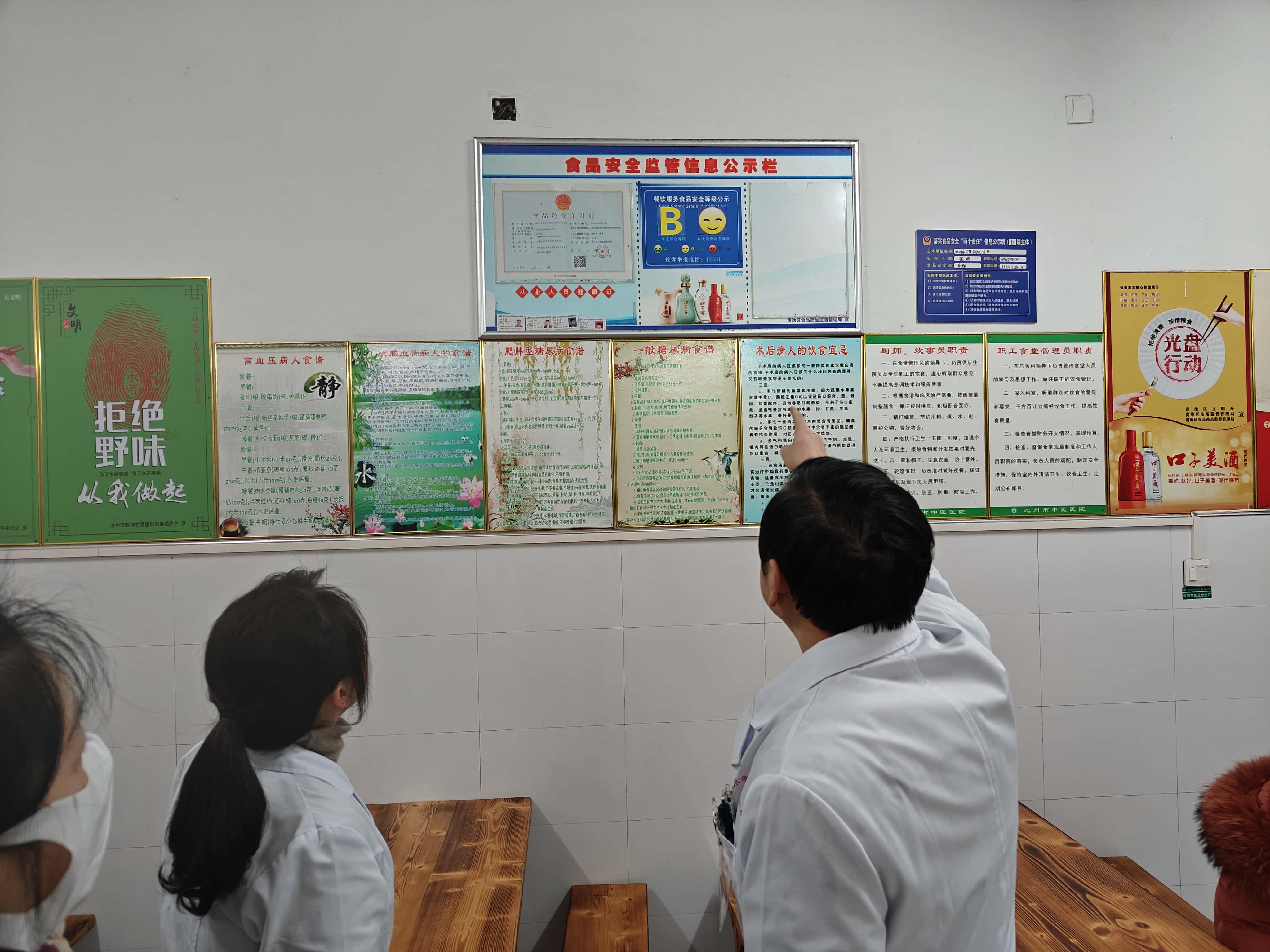 检查组一行先后对门诊大厅、停车场地、院内食堂、医废暂存间进行查看,重点对创卫宣传、车辆停放、食堂卫生、医废处置等内容进行现场检查指导,确保检查覆盖到每一个角落。分管领导在检查院内食堂时强调:食堂要严格按照创卫标准,前台后厨卫生干净整洁,食堂从业人员证件齐全,时刻保持防鼠防蝇设施齐全有效,以确保供给餐饮的健康性与卫生性,为池州创建国家卫生城市贡献力量。