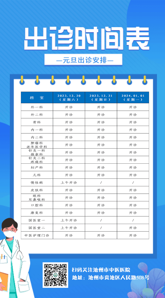 为切实保障人民群众的身体健康和生命安全,2023年12月30日-2024年1月1日,医院执行“无假日门诊”服务,请您根据自身情况合理安排就诊。