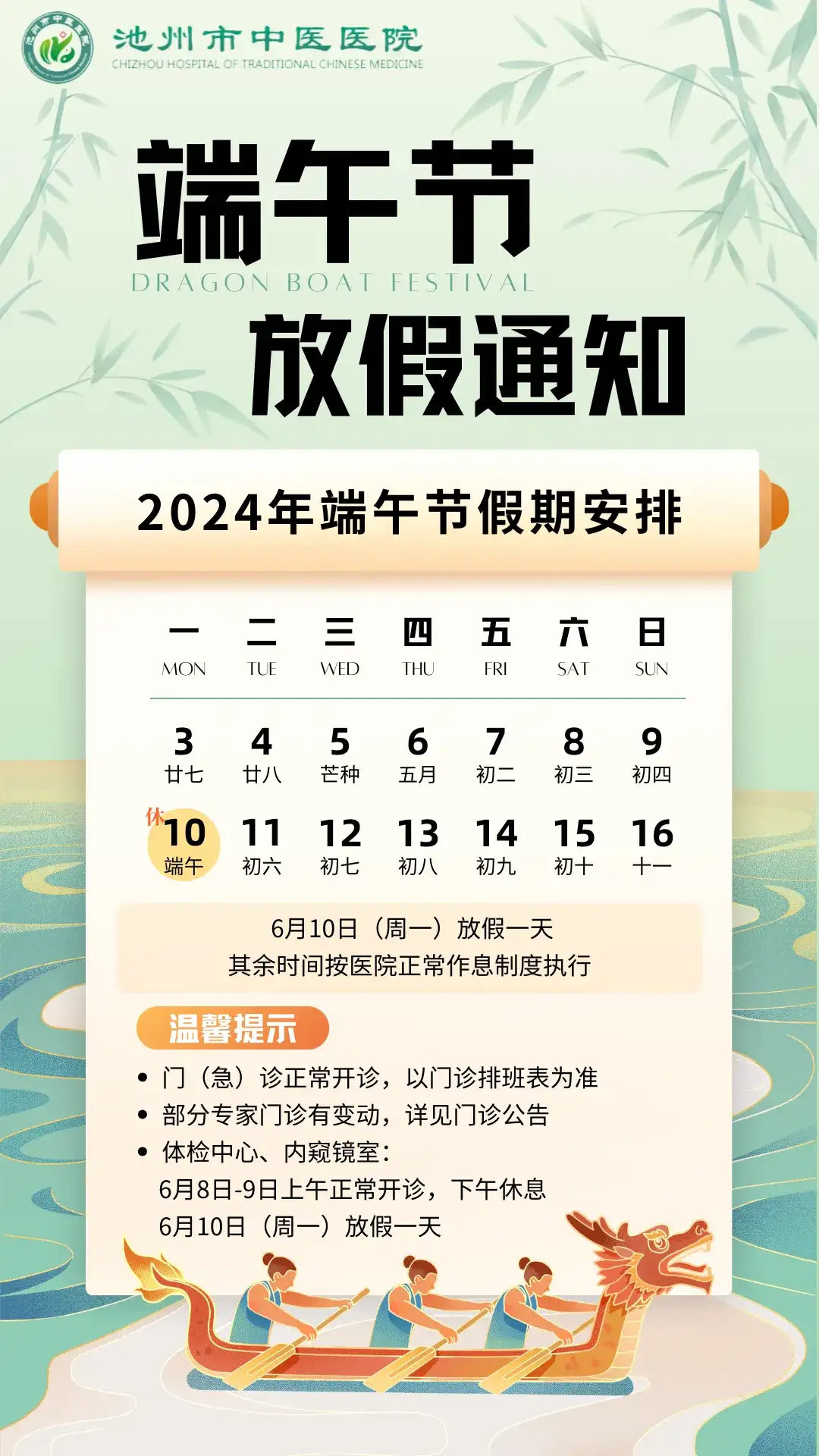 > 池州市中医医院2024年端午节假期安排