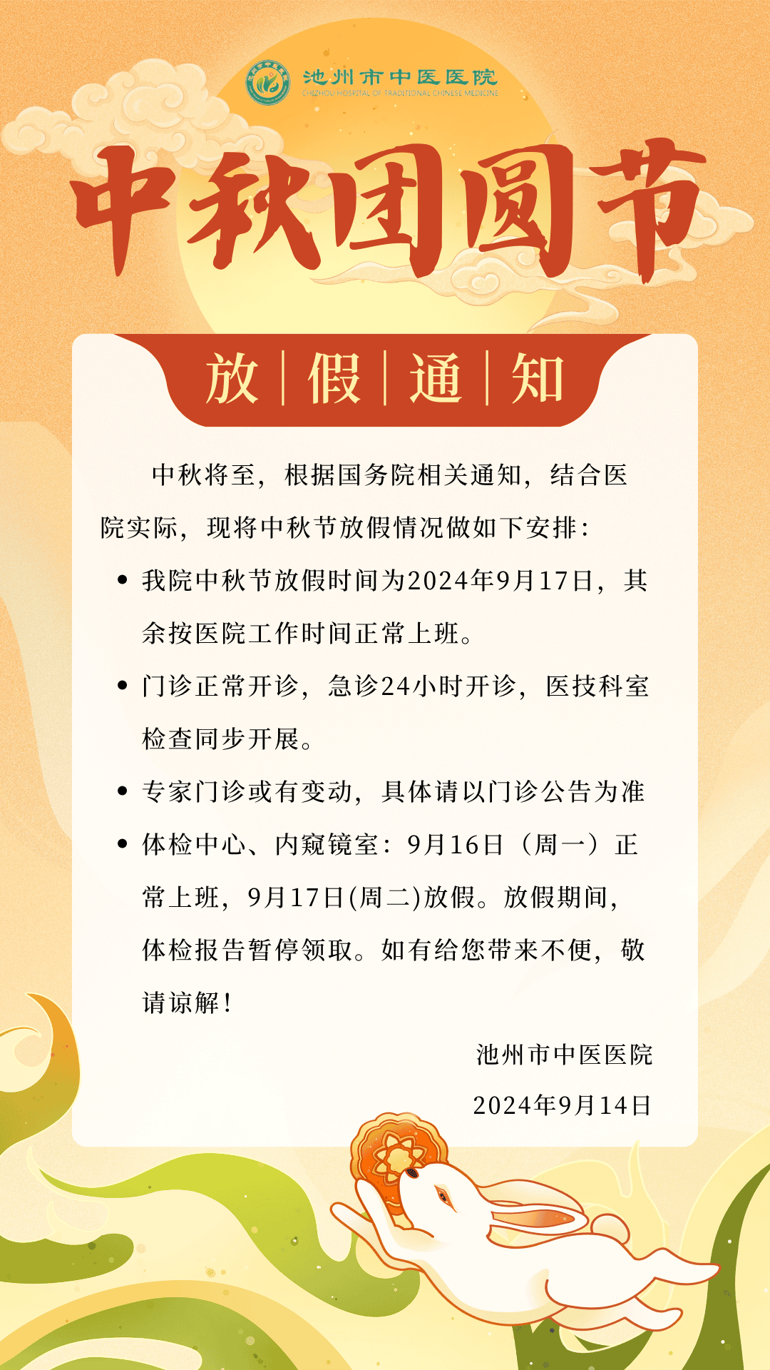 > 池州市中医医院2024年中秋节假期安排