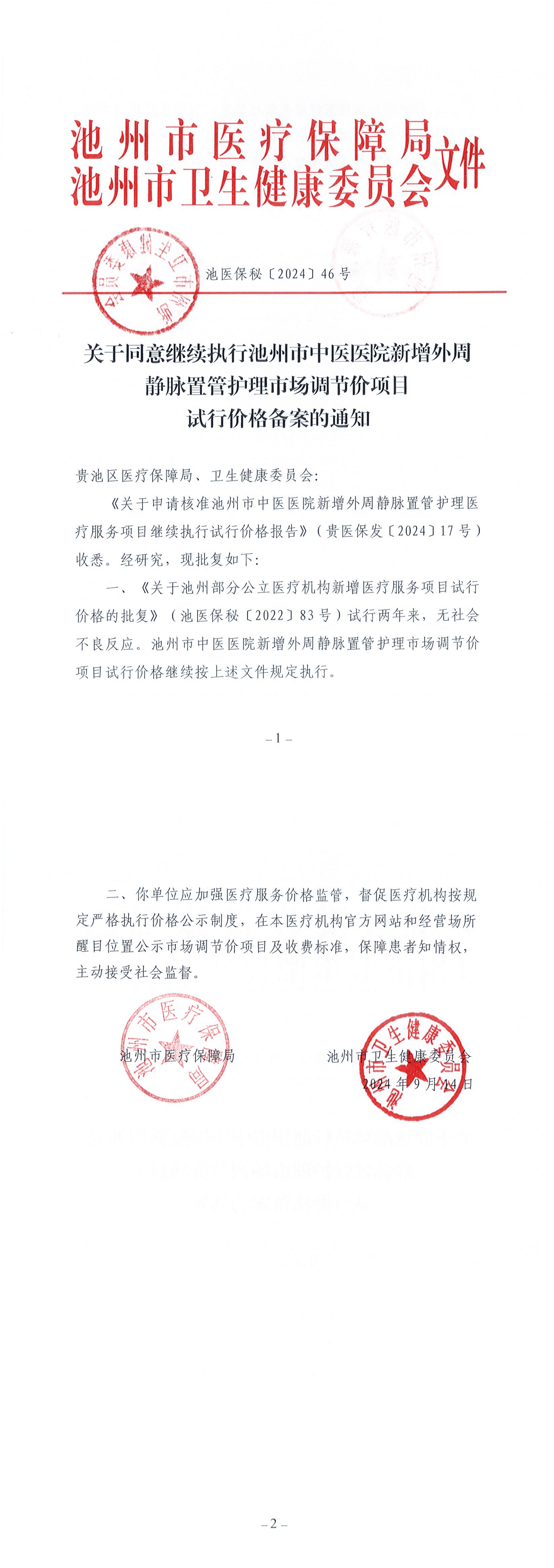 关于同意继续执行池州市中医医院新增外周静脉置管护理市场调节价项目试行价格备案的通知