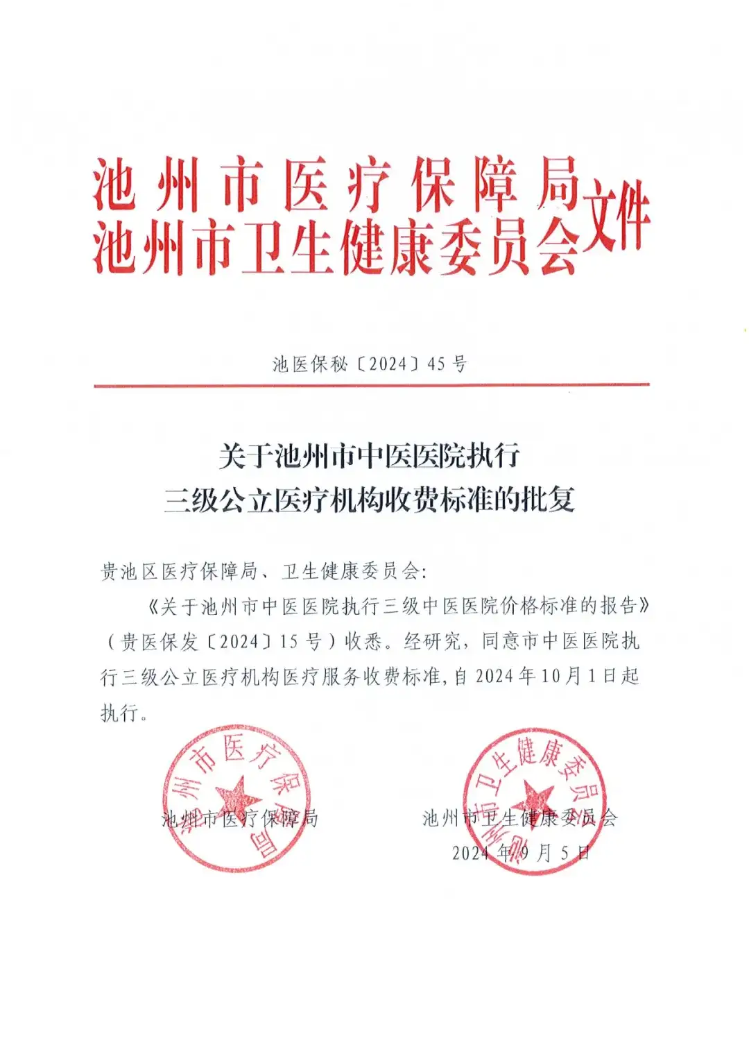 根据池州市医疗保障局、池州市卫生健康委员会联合下发的《关于池州市中医医院执行三级公立医疗机构收费标准的批复》(池医保秘〔2024〕45号)文件精神,从2024年10月1日起,池州市中医医院正式执行三级公立医疗机构医疗服务收费标准。
