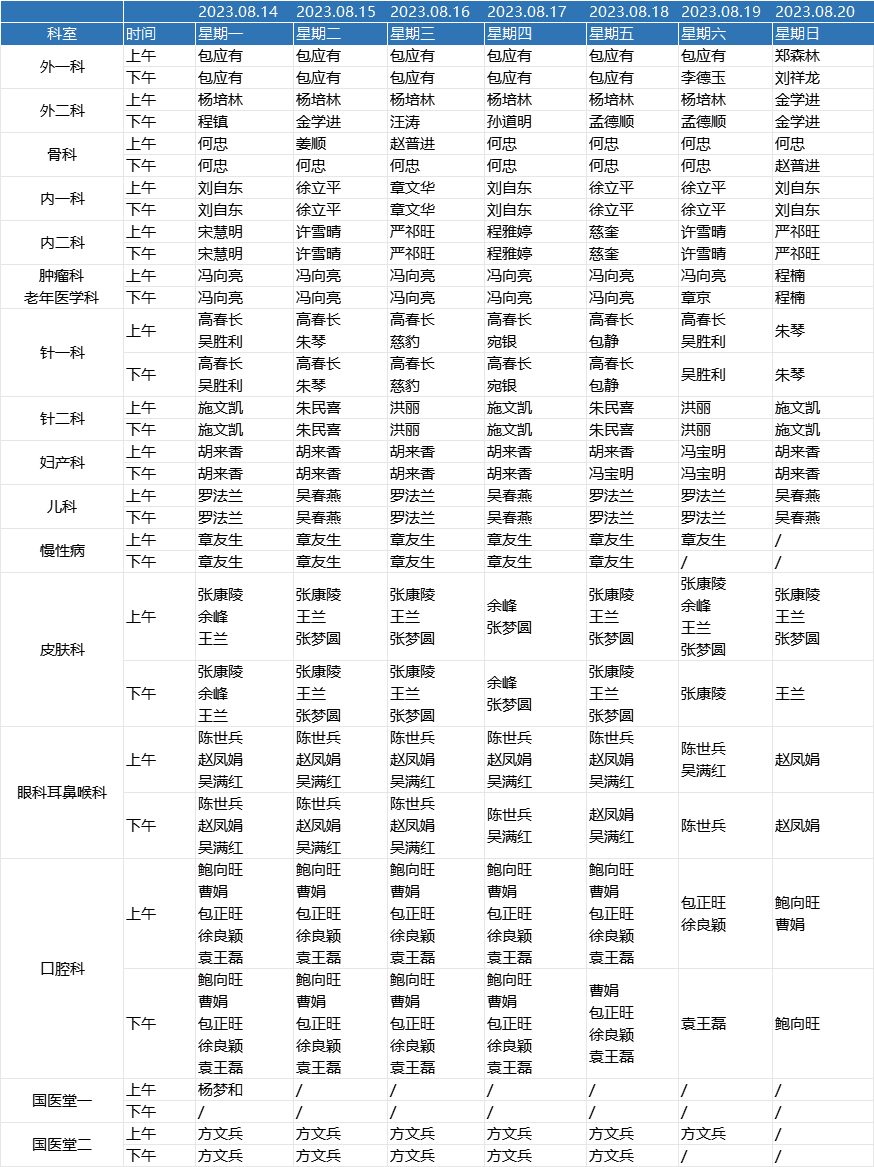为更好地服务广大市民朋友,方便就诊患者及时了解医院门诊排班情况,现将池州市中医医院2023年8月14日-8月20日门诊安排情况进行公布,请患者们根据需要合理安排就医时间。