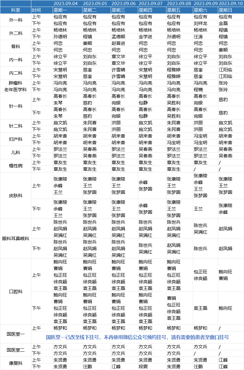 为更好地服务广大市民朋友,方便就诊患者及时了解医院门诊排班情况,现将池州市中医医院2023年9月4日-9月10日门诊安排情况进行公布,请患者们根据需要合理安排就医时间。