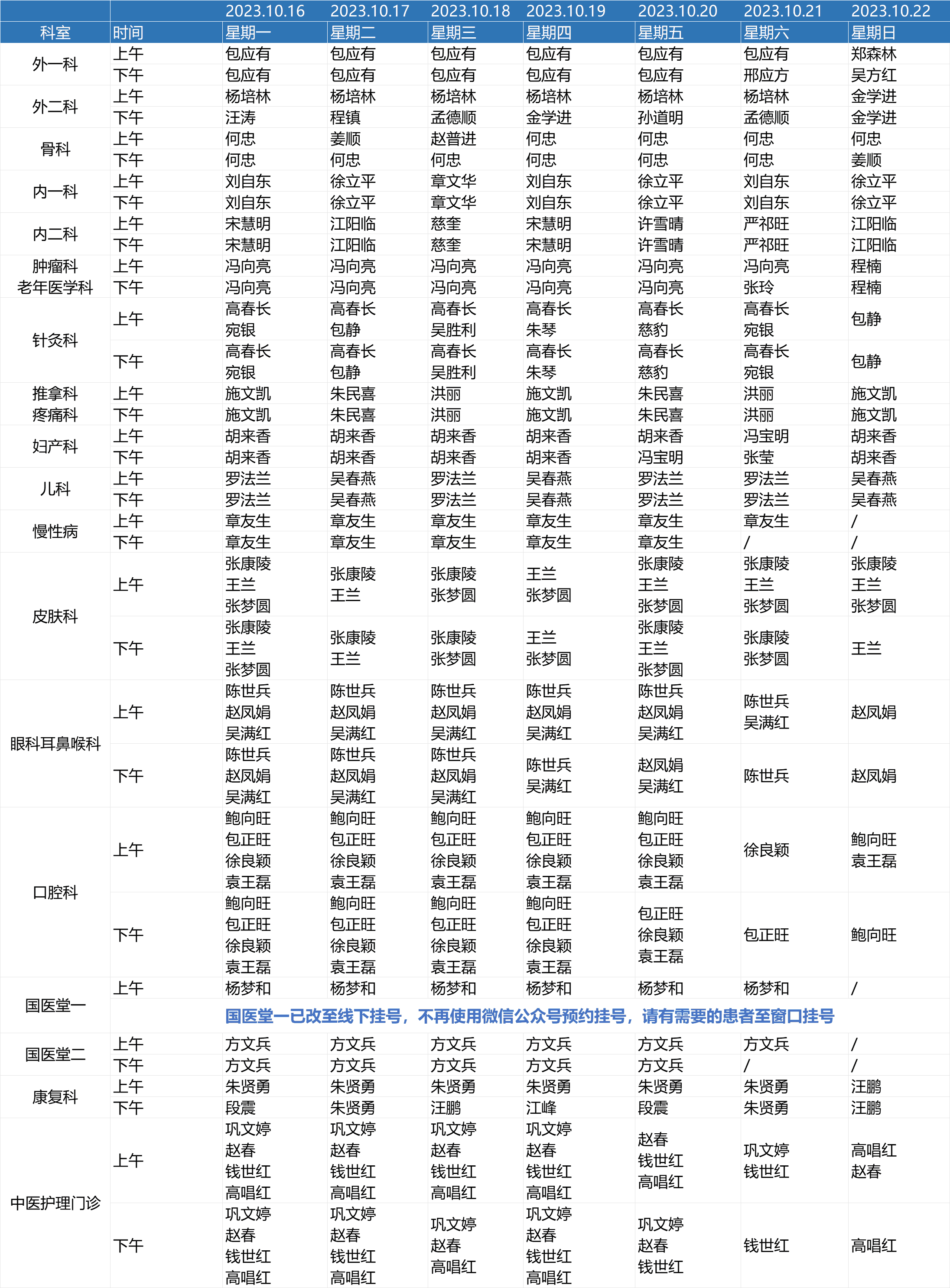 为更好地服务广大市民朋友,方便就诊患者及时了解医院门诊排班情况,现将池州市中医医院2023年10月16日-10月22日门诊安排情况进行公布,请患者们根据需要合理安排就医时间。
