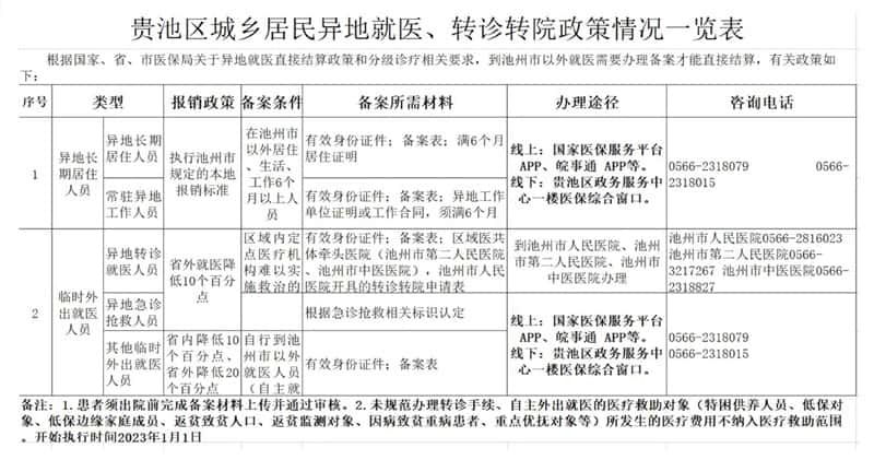 贵池区城乡居民异地就医、转诊转院政策情况一览表