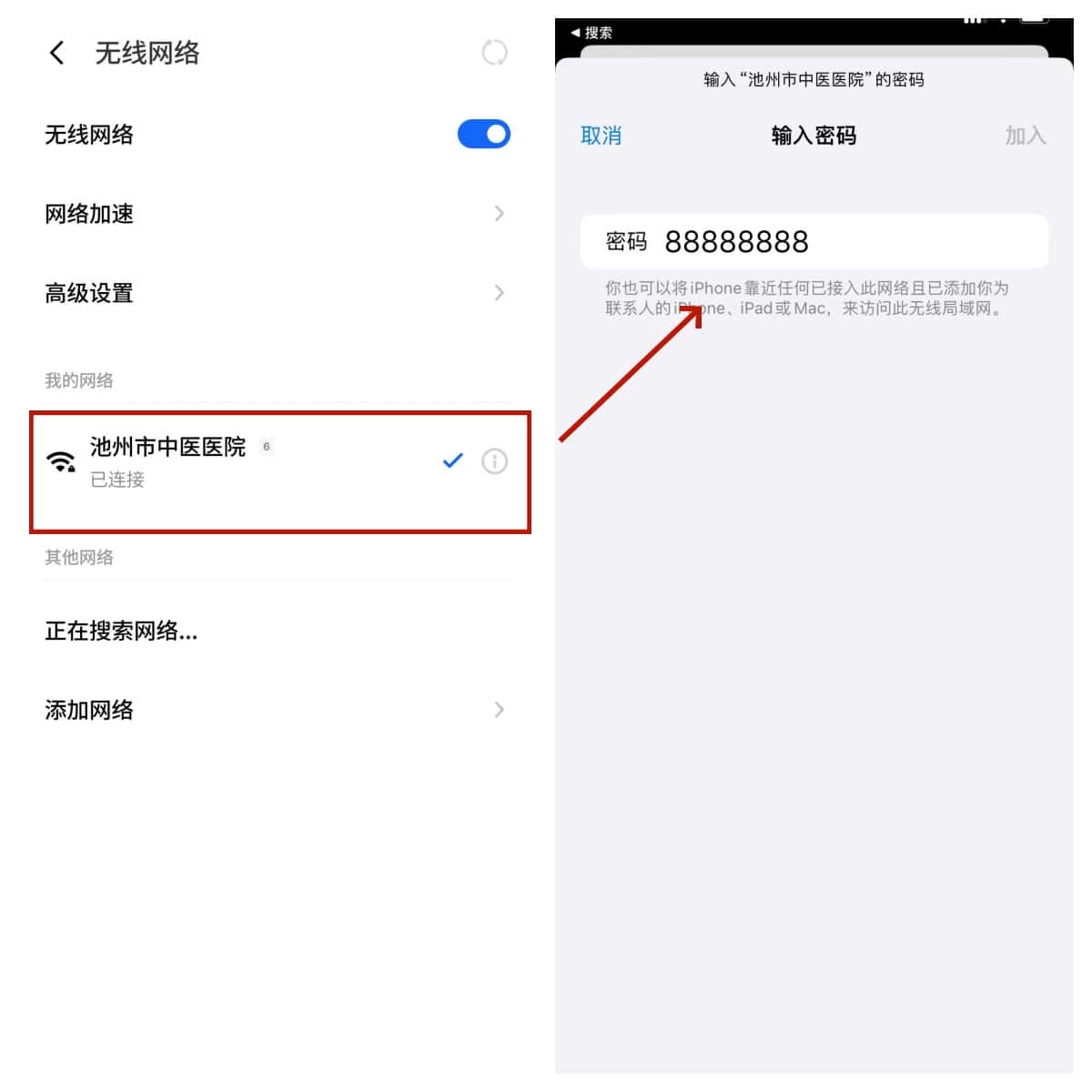 就诊患者及家属在诊疗过程中,可通过手机无线局域网搜索(WIFI名称:池州市中医医院)并连接,即可享受无线上网服务,同时可进行挂号预约、门诊缴费、报告查询等线上就医服务。
